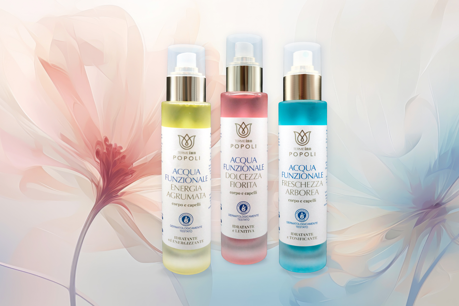 Le nuove acque funzionali di Terme Inn Popoli sono formulate per fornire un’idratazione veloce e una sensazione di freschezza rigenerante. Sono pensate per un utilizzo quotidiano, offrendo effetti idratanti e lenitivi, energizzanti o tonificanti, a seconda del prodotto.